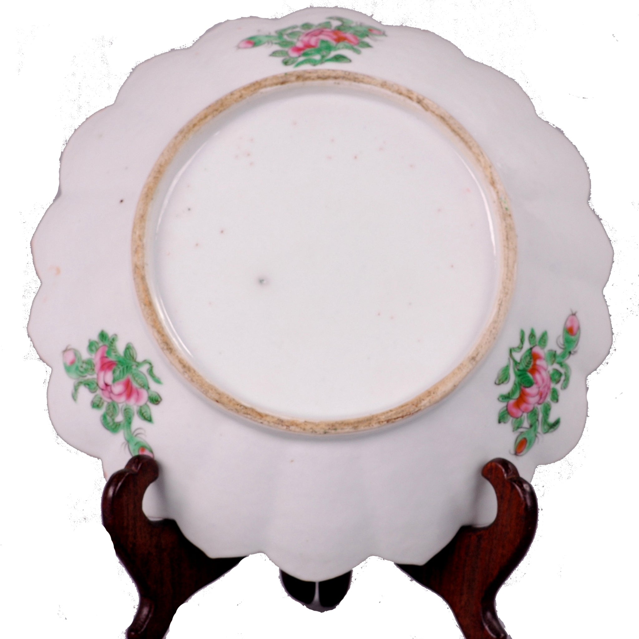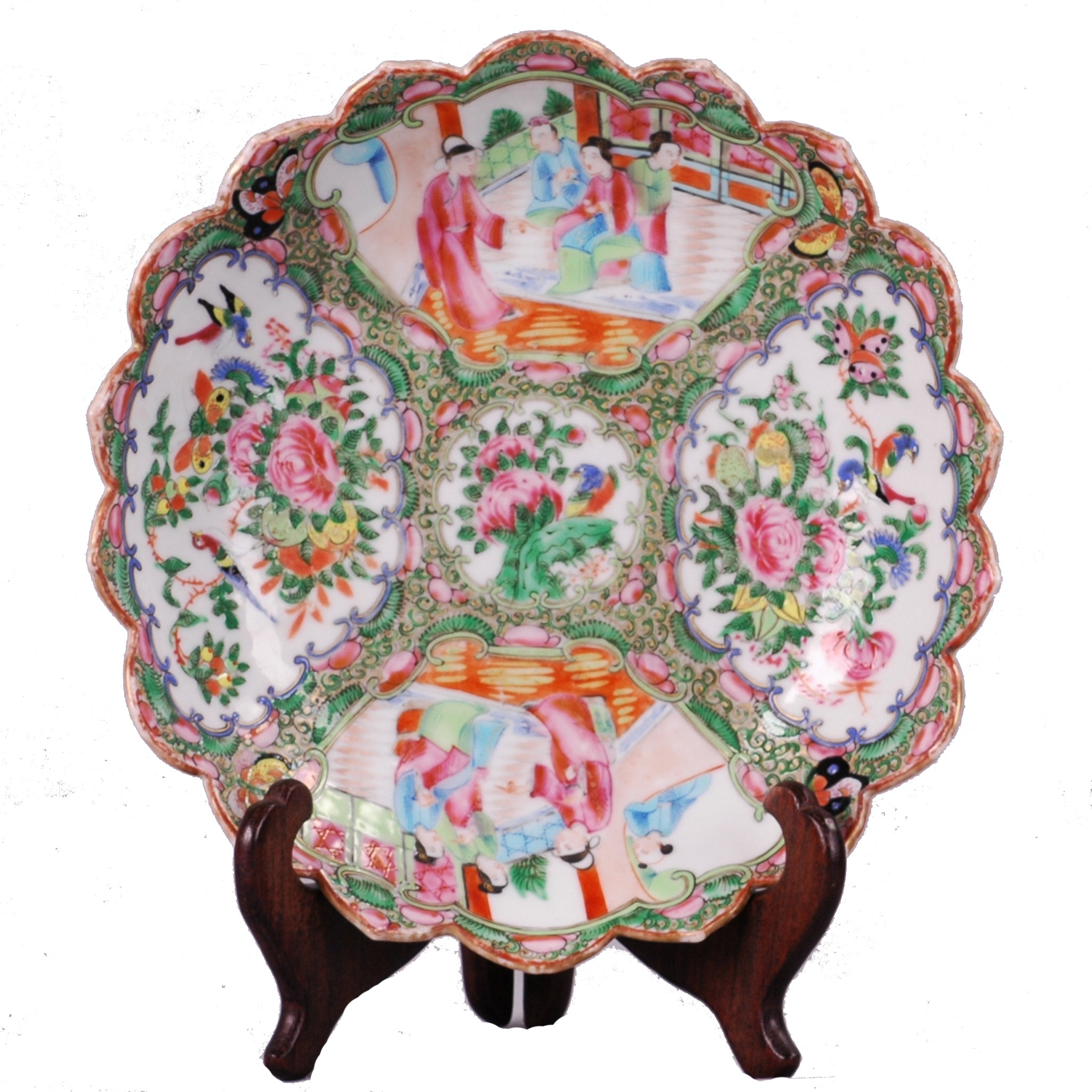 Late Qing dynasty, unmarked, with no damage or repairs. Rose Medallion is a 19th and 20th Century Chinese Export Porcelain. This plate, with the “petal” rim is delightfully unusual, and more of a collector’s piece than the typical smooth rim.