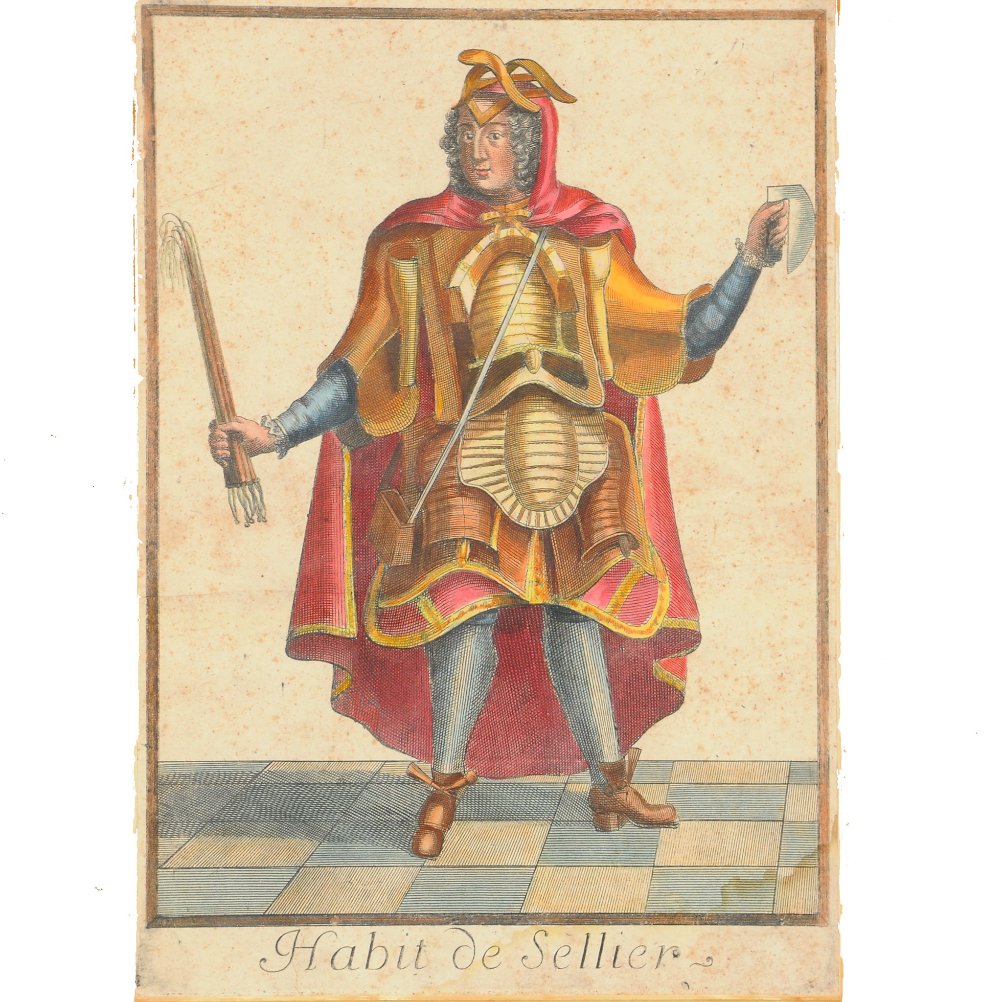 Original copperplate engraving titled Habit de Sellier (a saddle maker) from the series “Les Costumes Grotesques” on laid paper. In overall good condition is with minor toning, very gentle rippling, and water staining to bottom margin. From a series of satirical prints first started by Nicolas I de Larmessin (1634-1694) and continued by his younger brother Nicolas II de Larmessin (1640-1725), who re-engraved his brother's images in reverse starting in 1695 and added a number of his own original works to the series. This is one of Nicolas II's re-engravings in reverse, in which the background is simplified. Between the two brothers, there were over 80 satirical etchings produced of professions and trades, all rare on the market. They surely owe a debt to Archimboldo, and perhaps Dali, Ernst and others owe a debt to Larmessin.