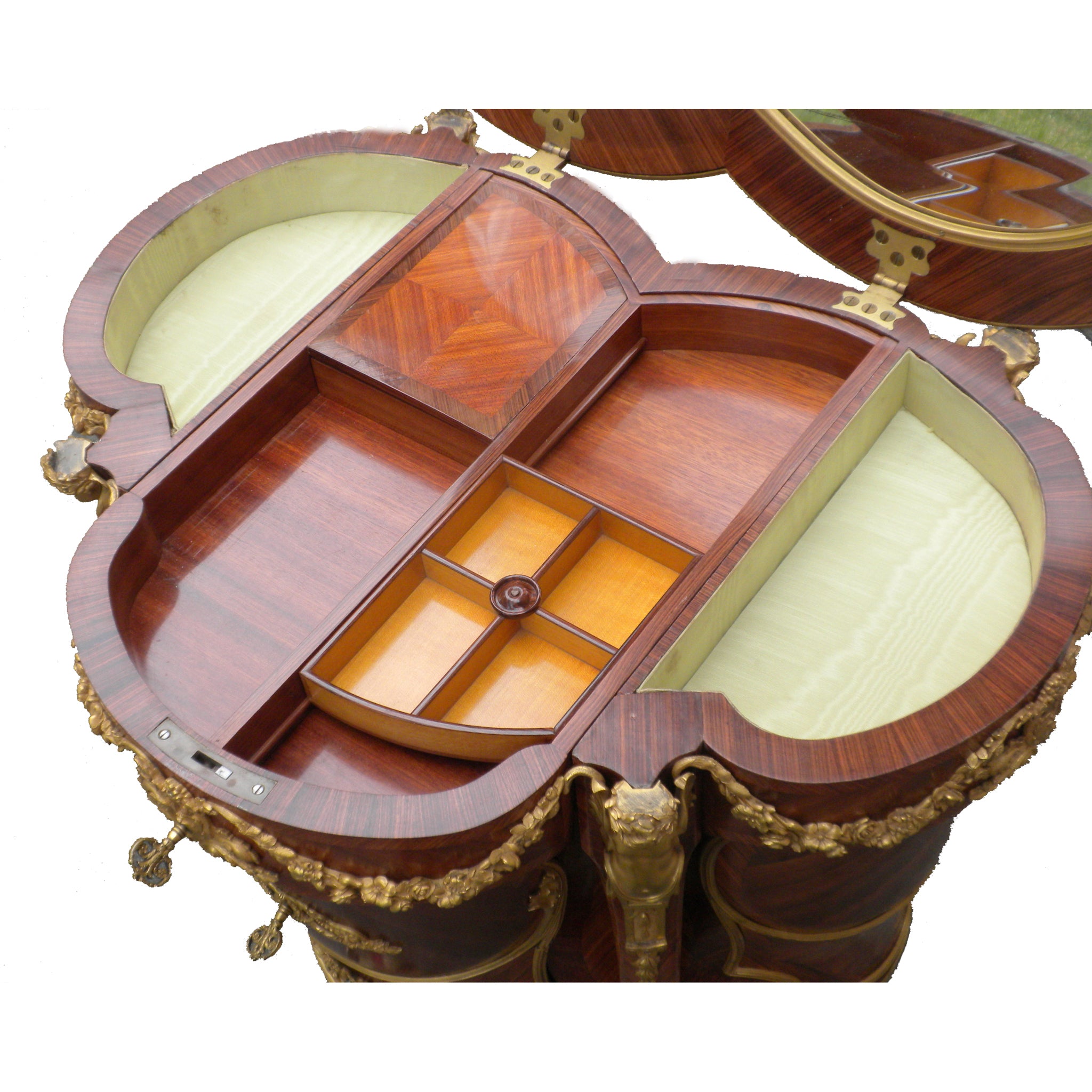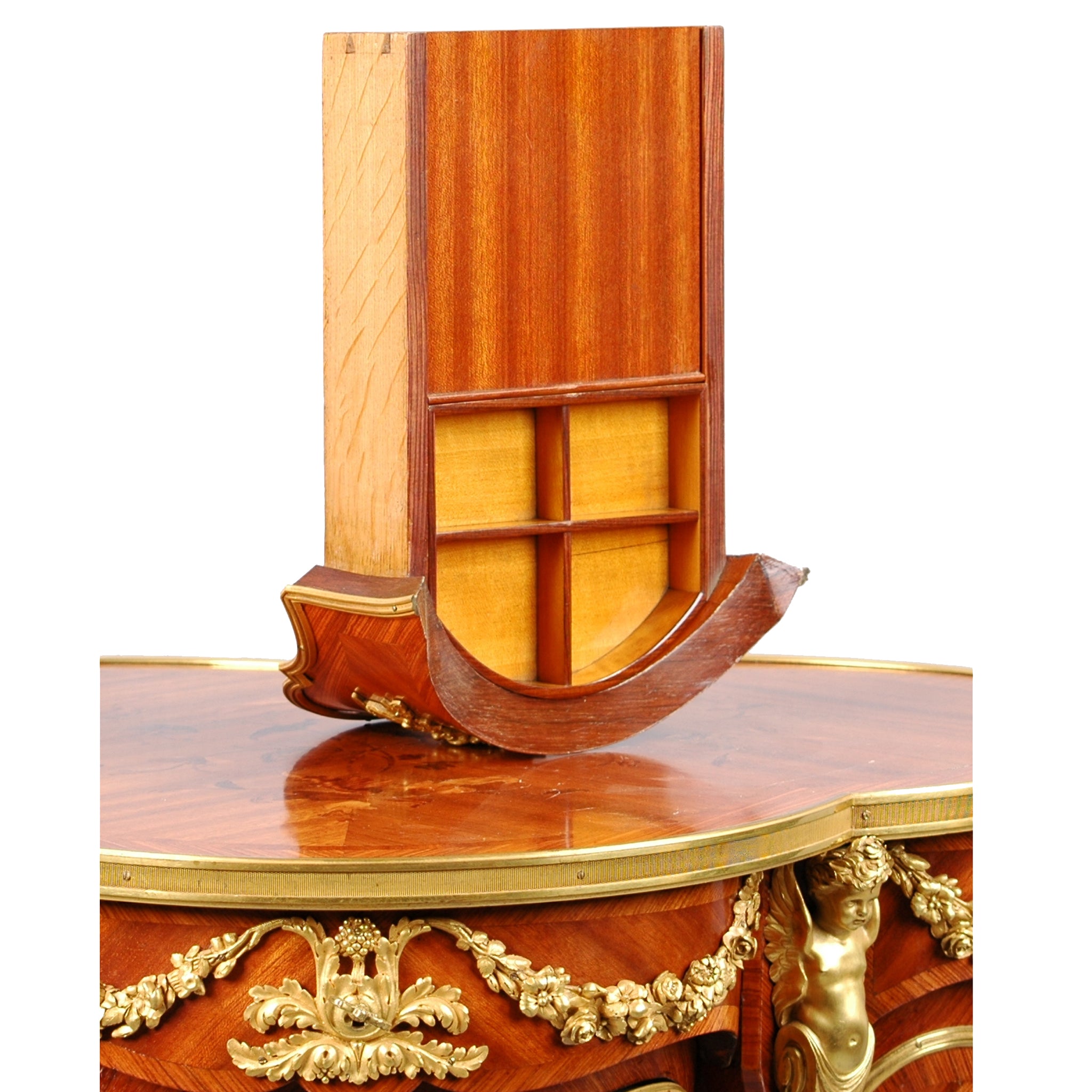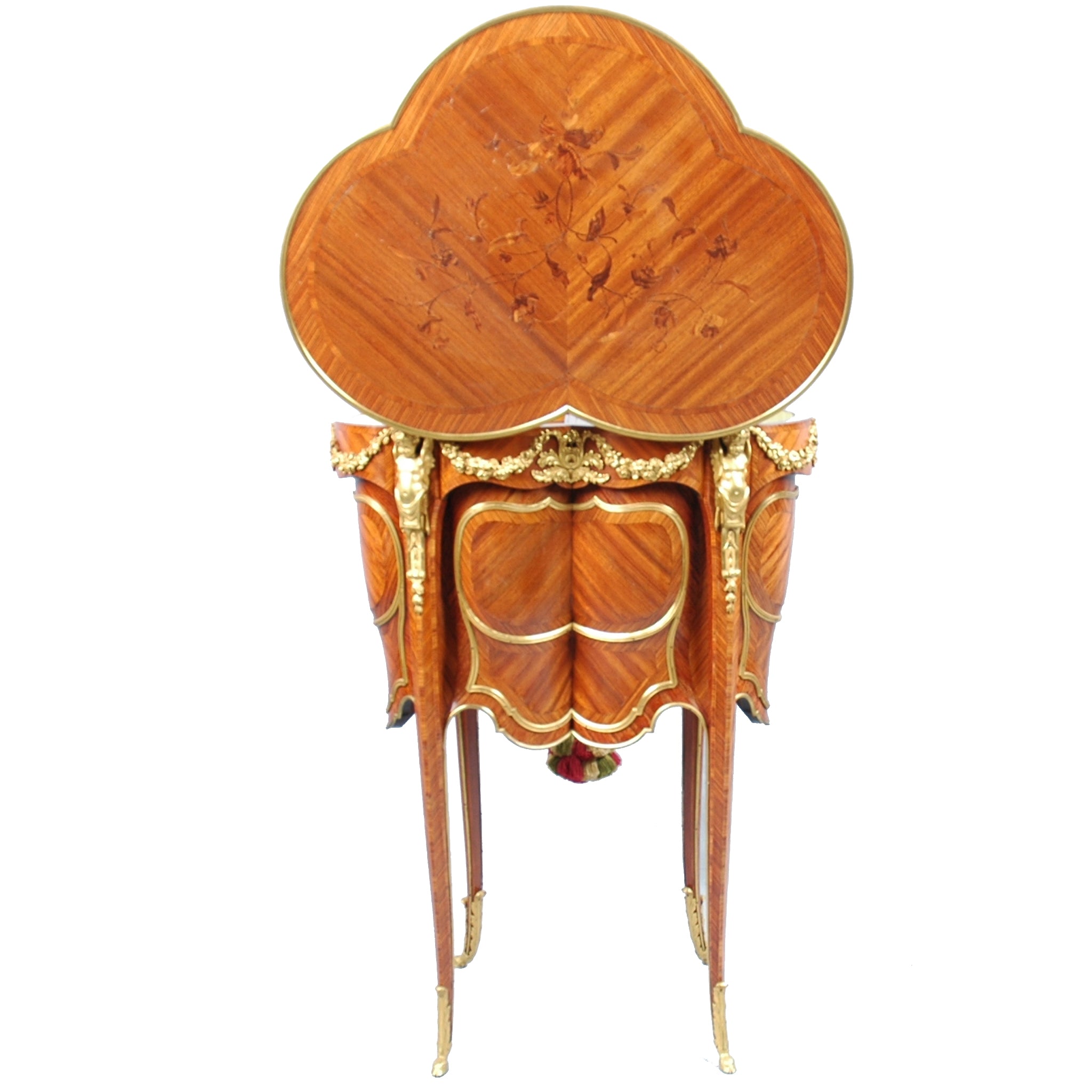 Louis XV style extremely fine and rare table made by Alfred-Emmanuel-Louis Beurdelay. Signed “BY” on the back of at least one of the ormolu mounts. The fine, hand-chased ormolu and the skillful and unusual joinery combine to tell the mastery of its creator. It has a beautiful three lobed shape, made of rosewood with floral inlay on the top. The top is hinged, and opens to reveal a fitted interior, over two smaller drawers. The perfectly proportioned legs terminate in pied de biche (doe’s feet) ormolu. France, c.1875