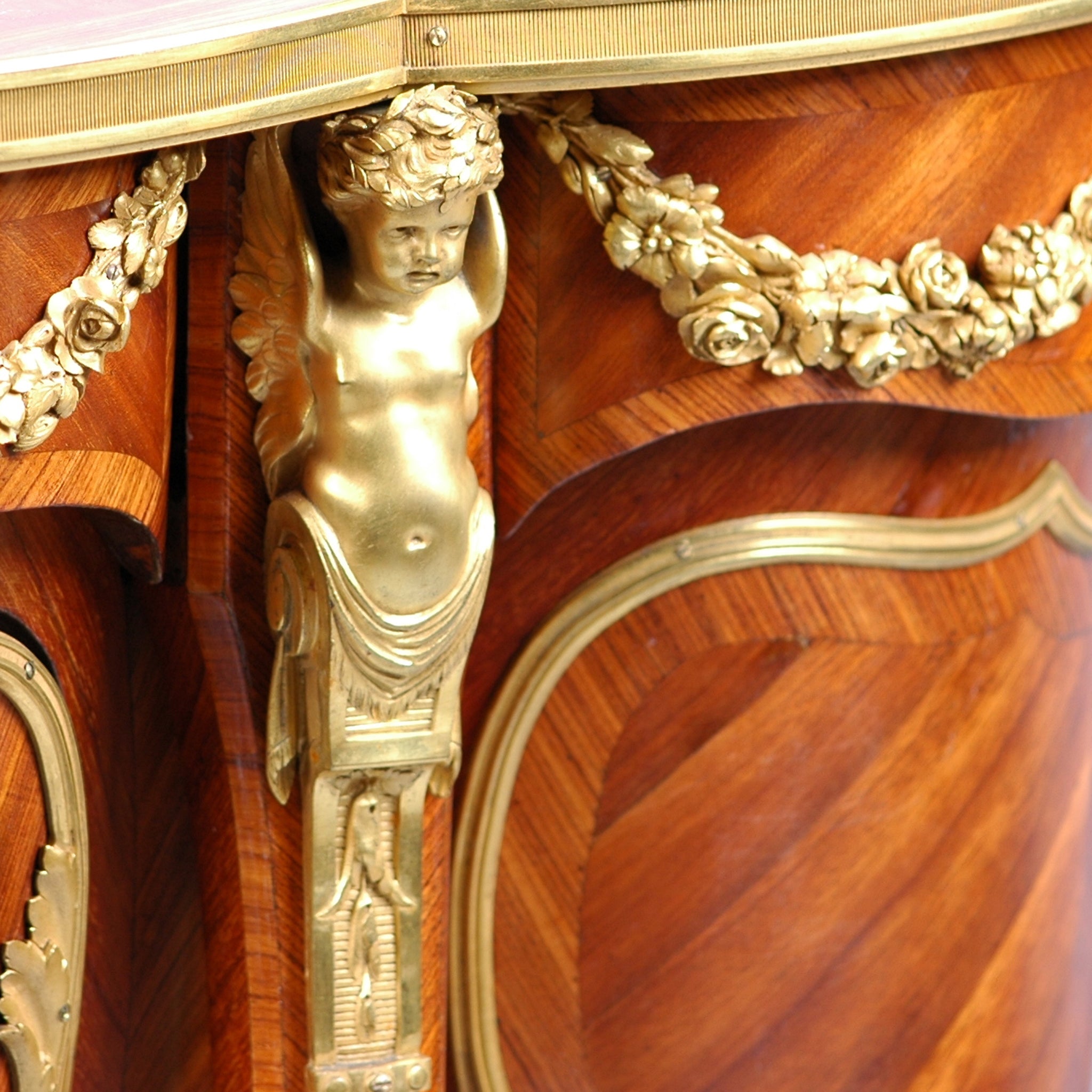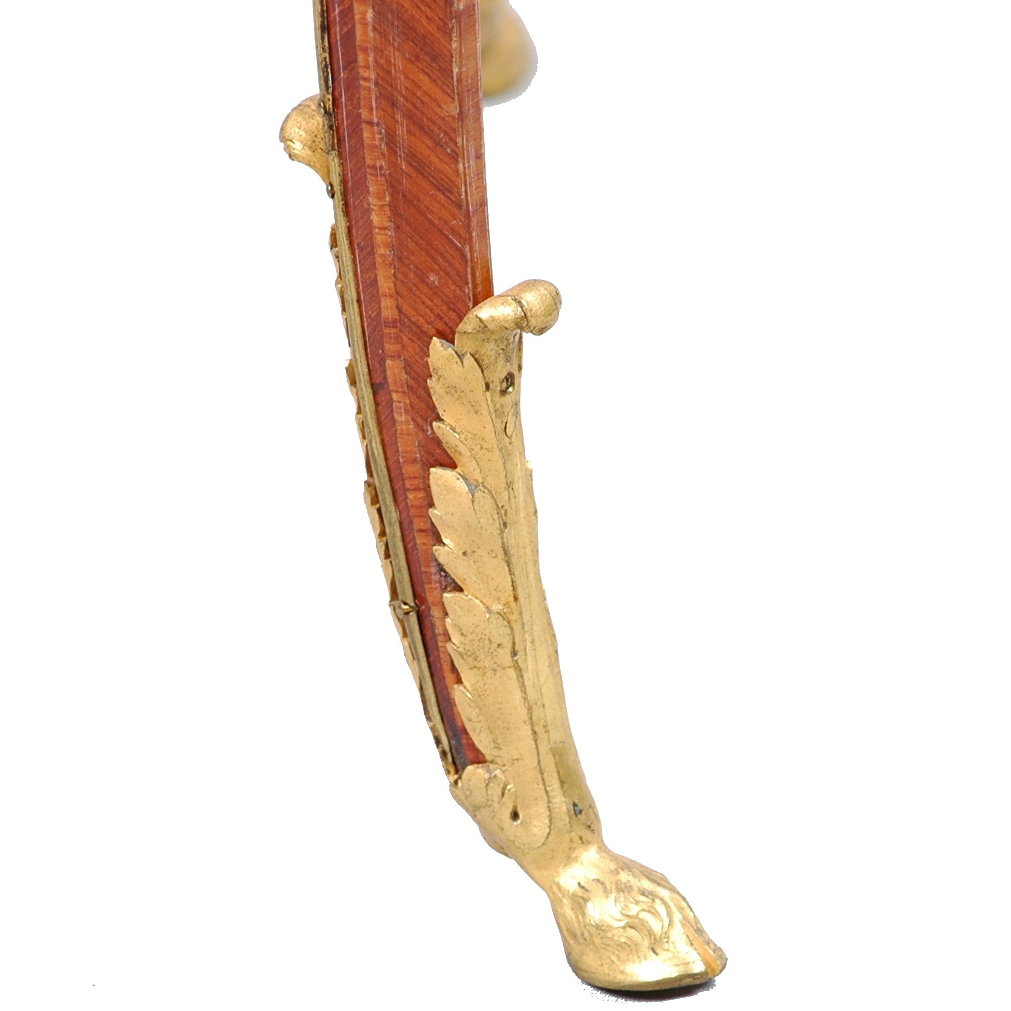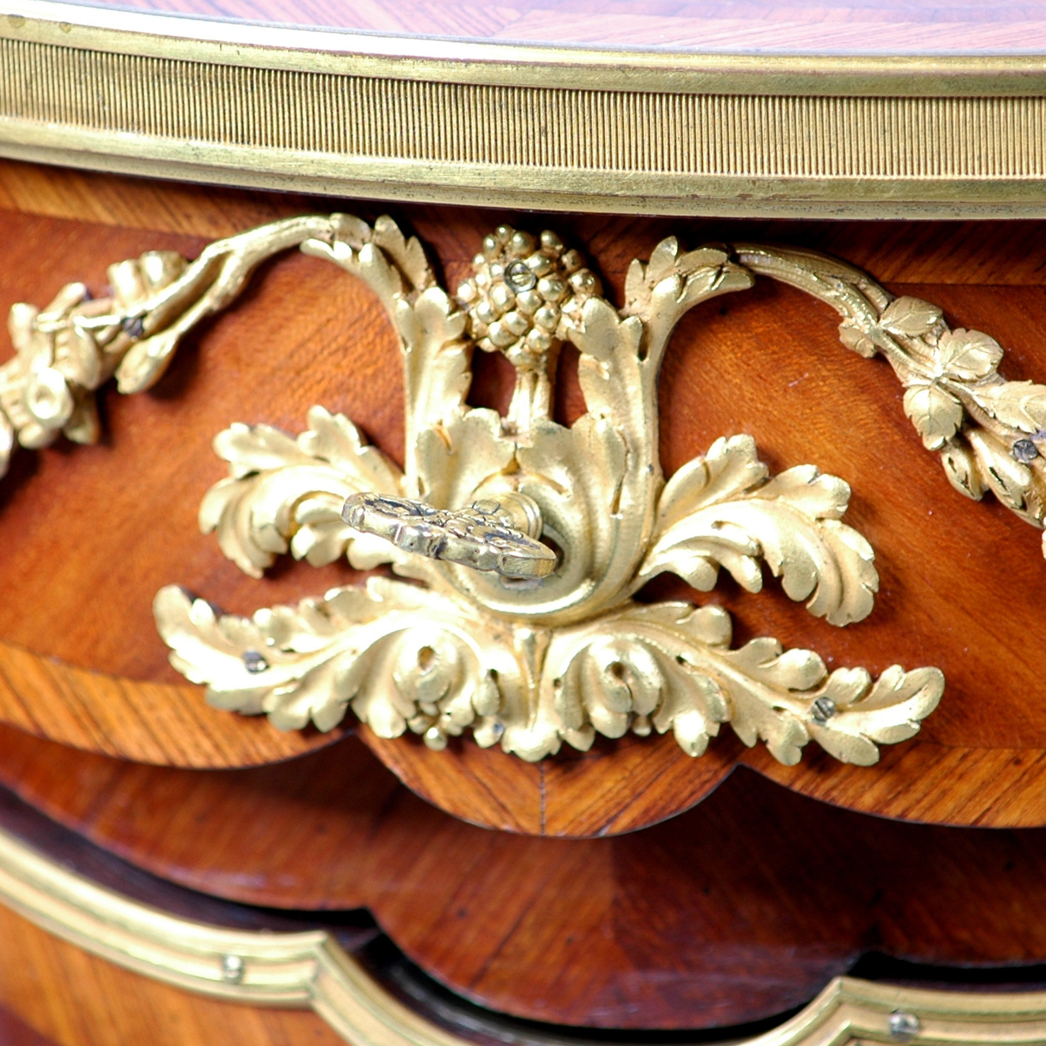 Louis XV style extremely fine and rare table made by Alfred-Emmanuel-Louis Beurdelay. Signed “BY” on the back of at least one of the ormolu mounts. The fine, hand-chased ormolu and the skillful and unusual joinery combine to tell the mastery of its creator. It has a beautiful three lobed shape, made of rosewood with floral inlay on the top. The top is hinged, and opens to reveal a fitted interior, over two smaller drawers. The perfectly proportioned legs terminate in pied de biche (doe’s feet) ormolu. France, c.1875